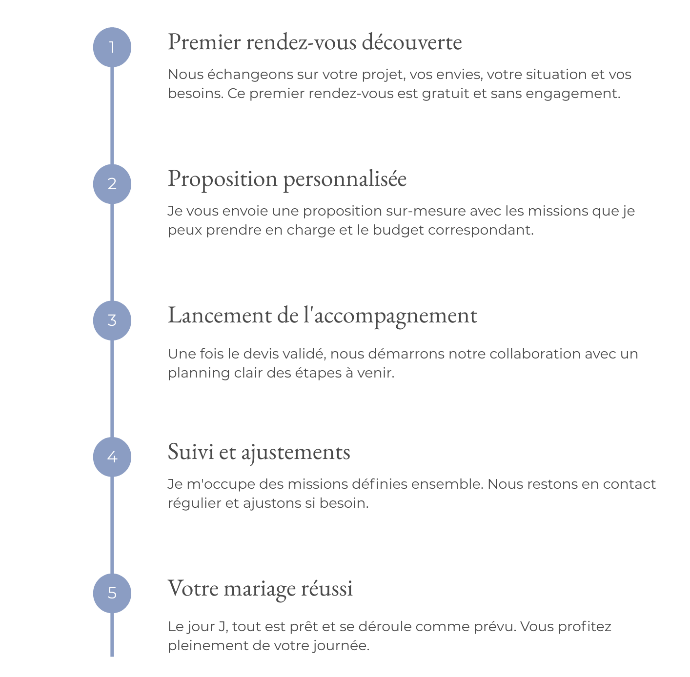 Chaque couple est unique, chaque mariage est différent. Vous avez peut-être besoin d’une aide ponctuelle sur un aspect précis, ou au contraire d’un accompagnement complet de A à Z.