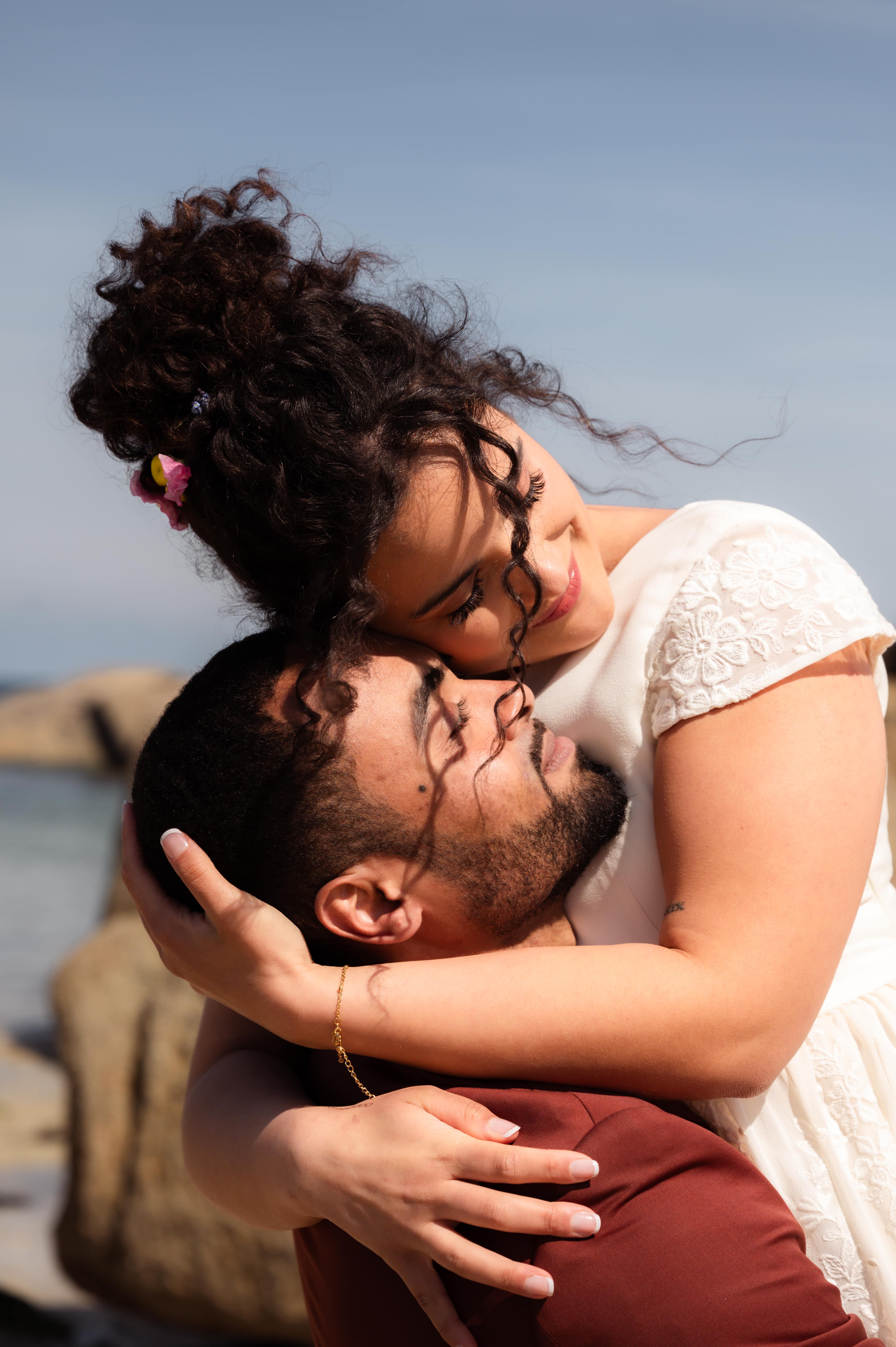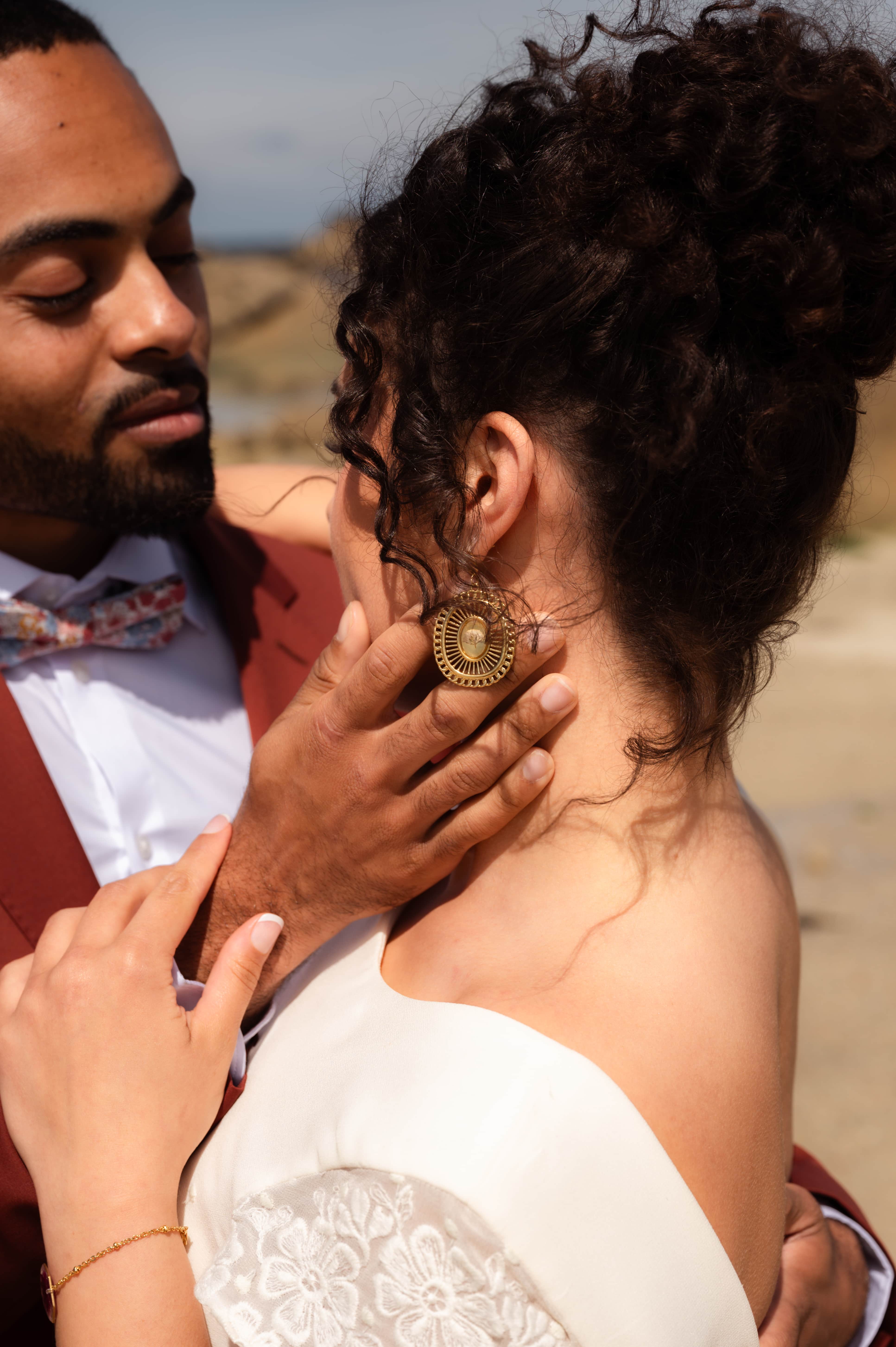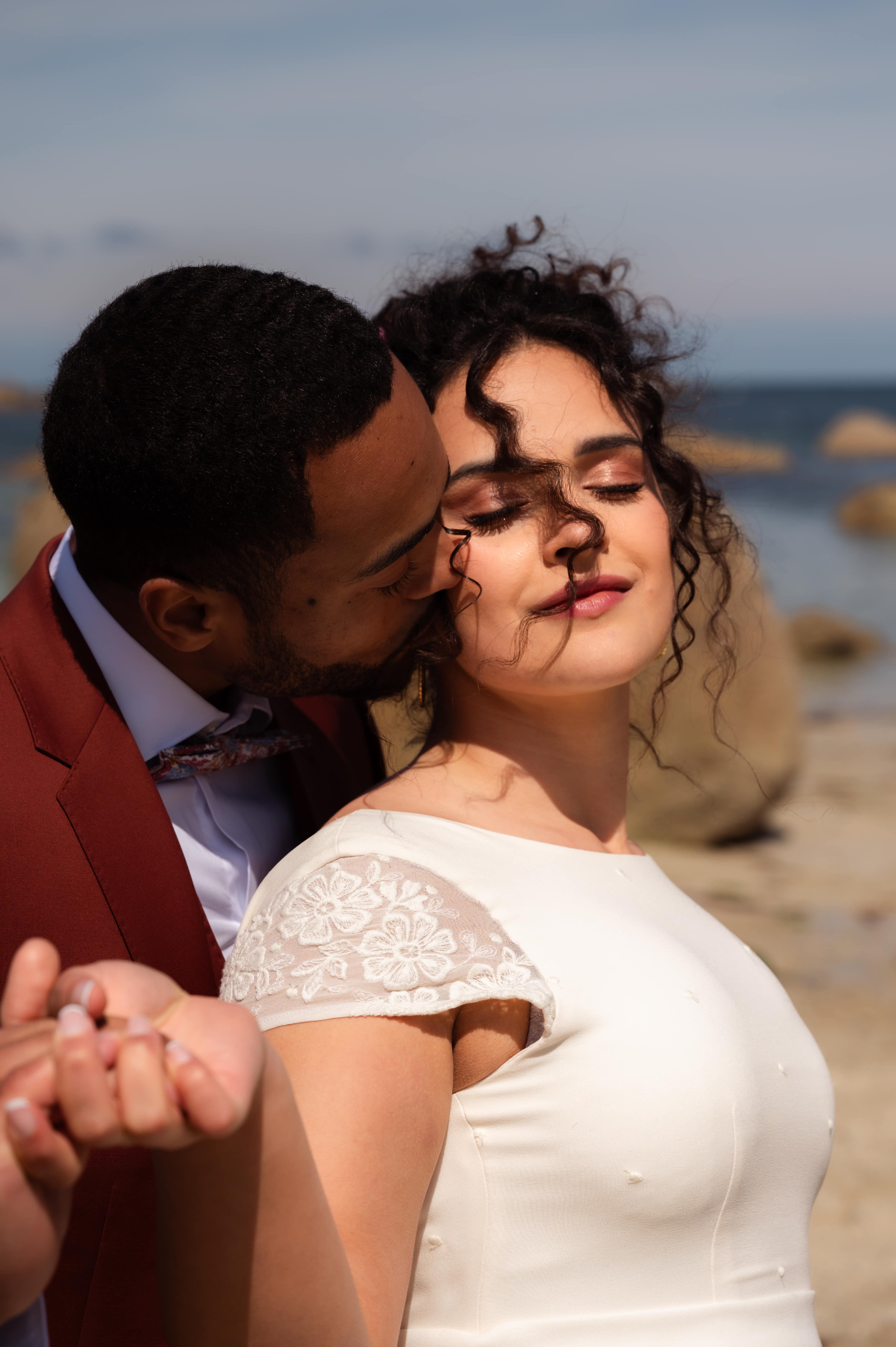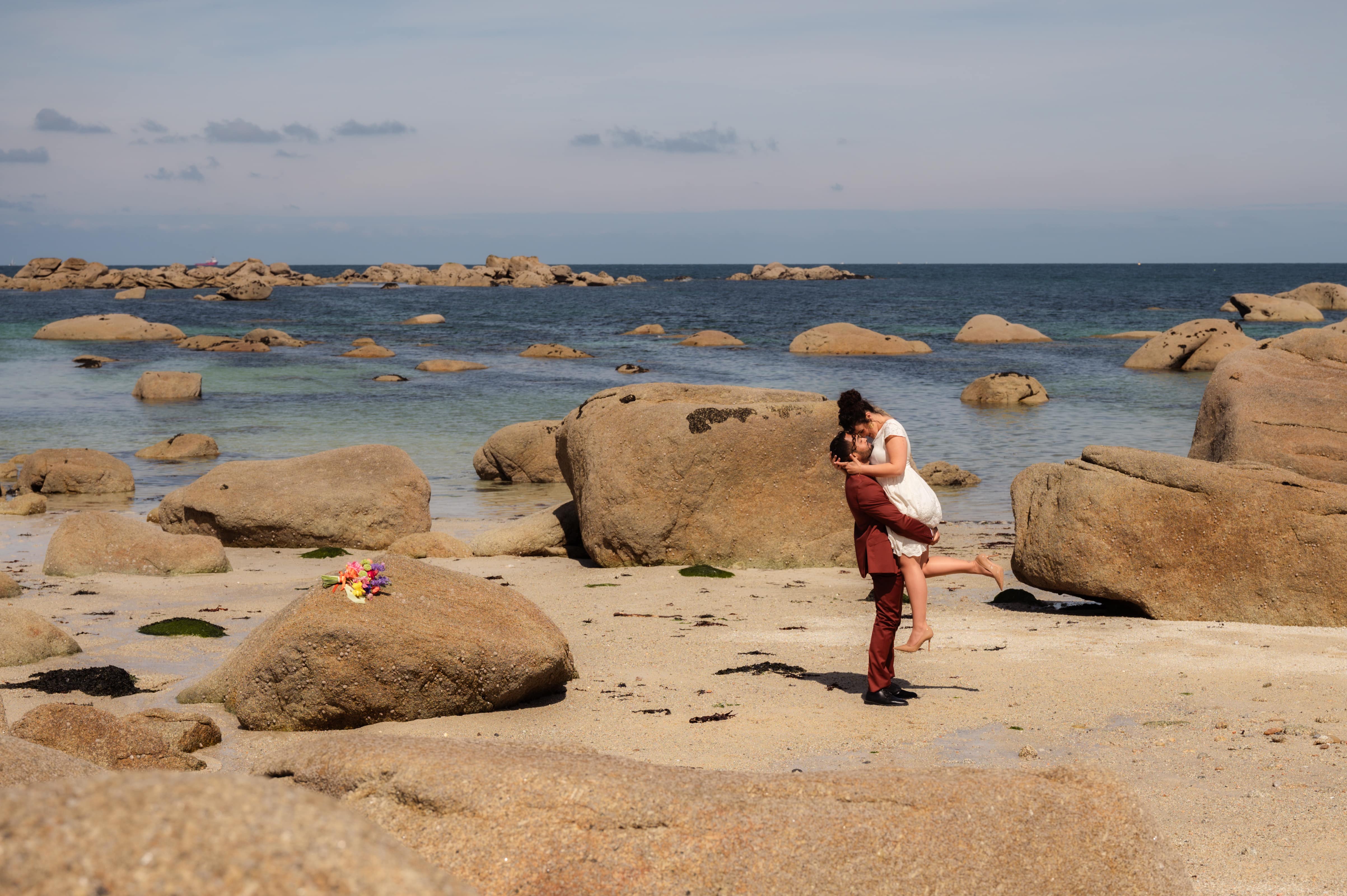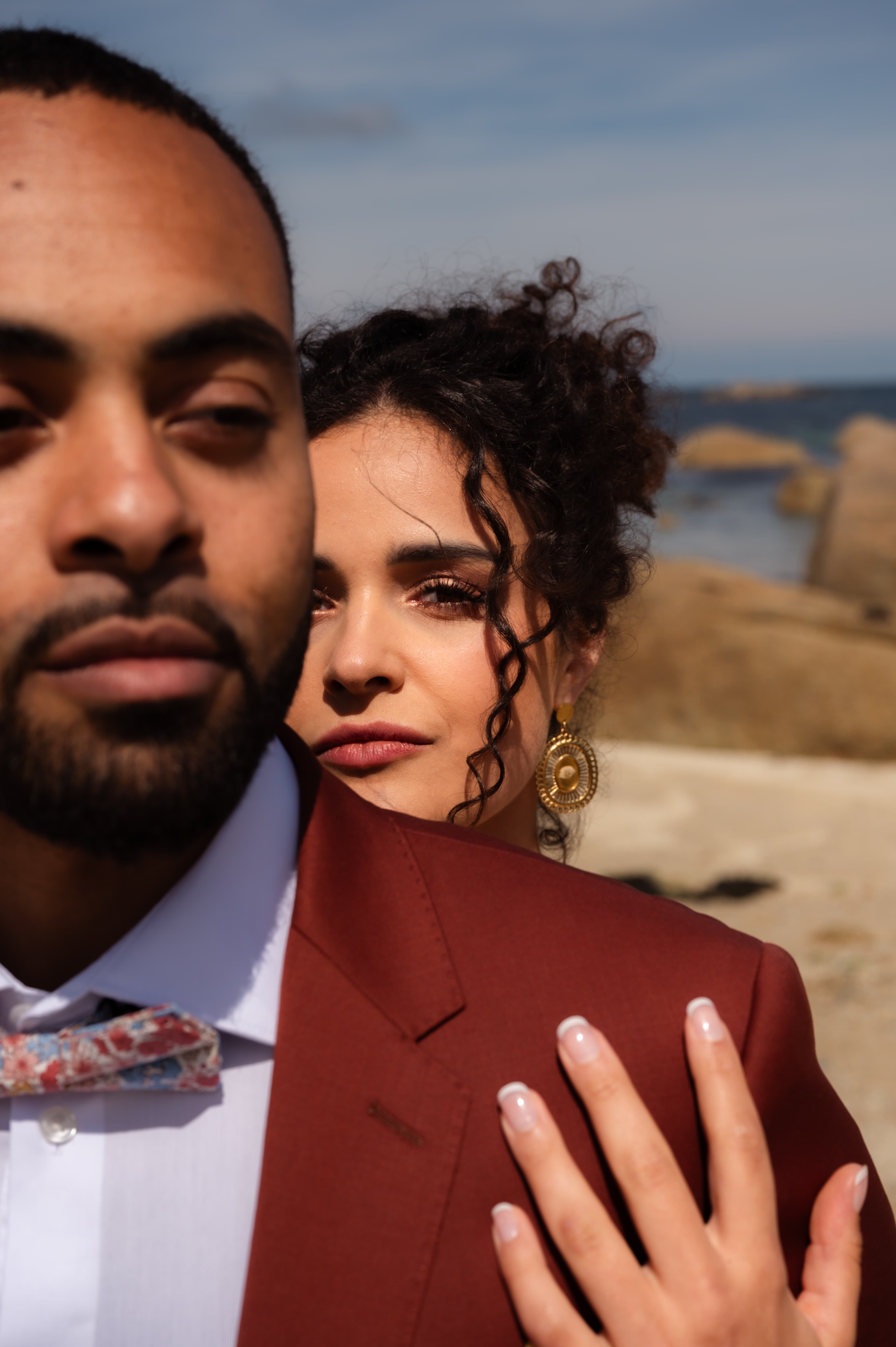 Le décor marin de la Côte des Légendes offre un contraste naturel saisissant : plages sauvages, rochers sculptés par le vent, mer turquoise… Un terrain de jeu parfait pour raconter une histoire d’amour intime et lumineuse.