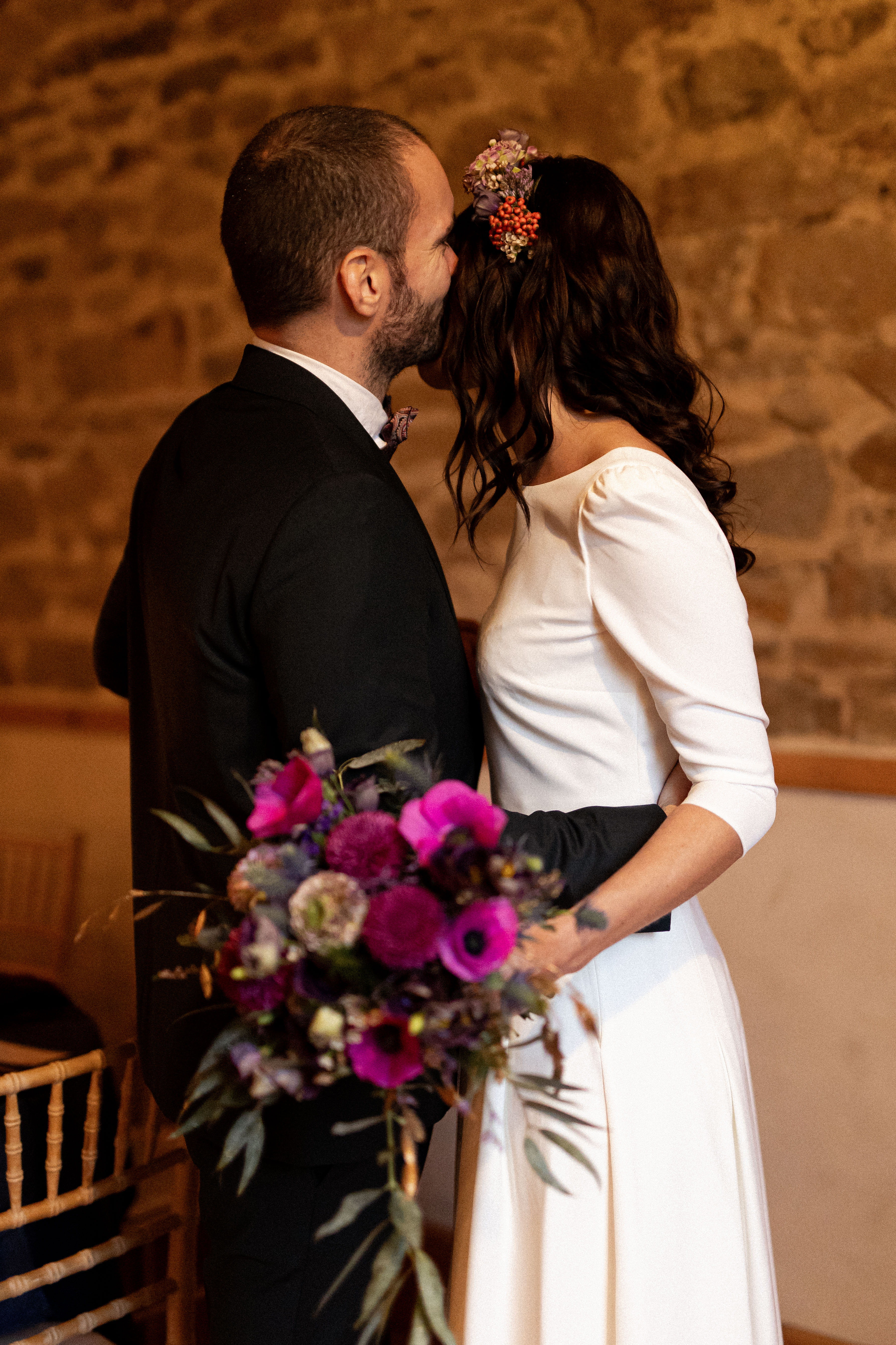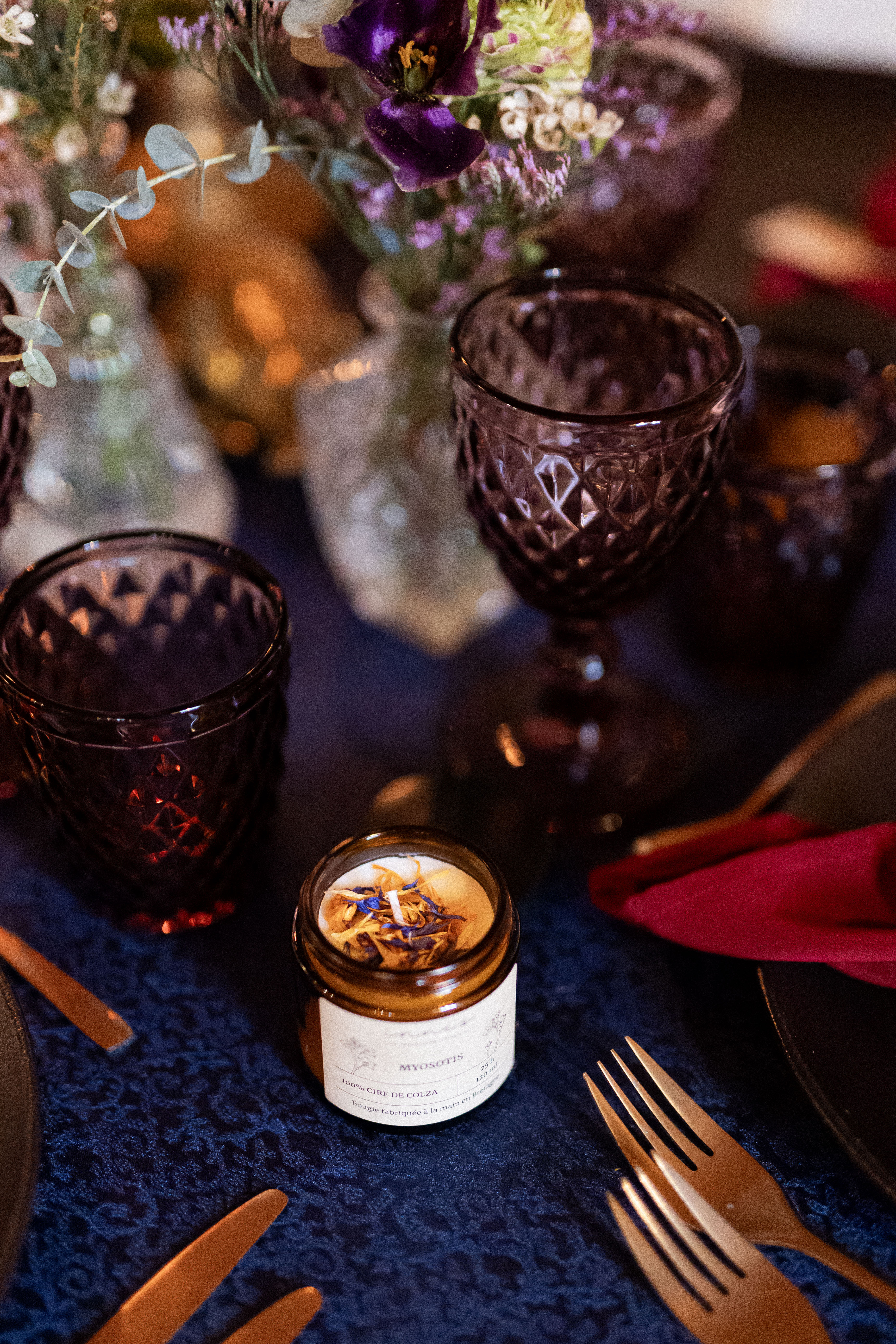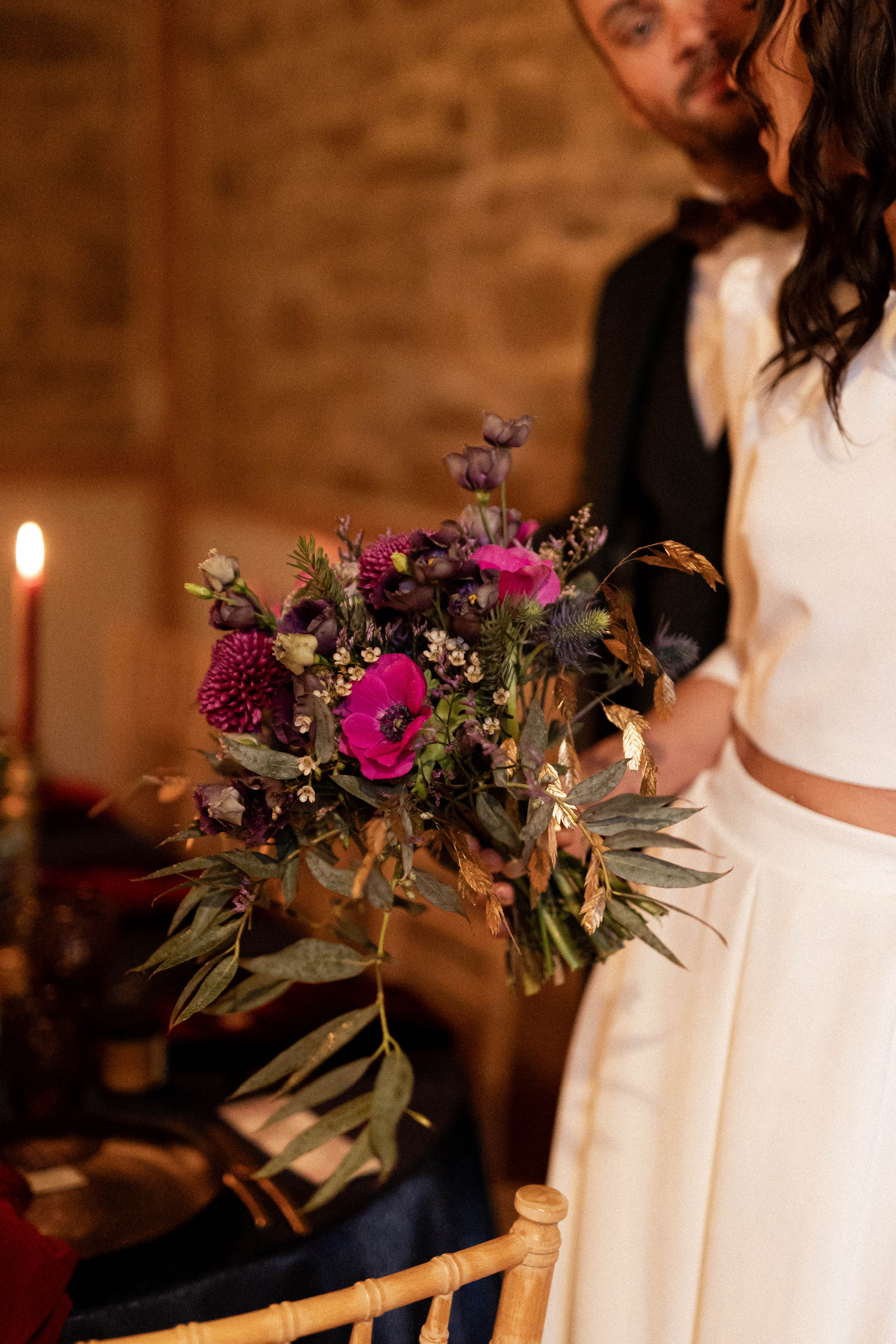 Sklaerenn de L’Atelier Doussik a choisi des fleurs de saison françaises dans des tons chauds, relevés de touches dorées. Chaque bouquet semble vivant, comme cueilli dans un jardin ancien au crépuscule.