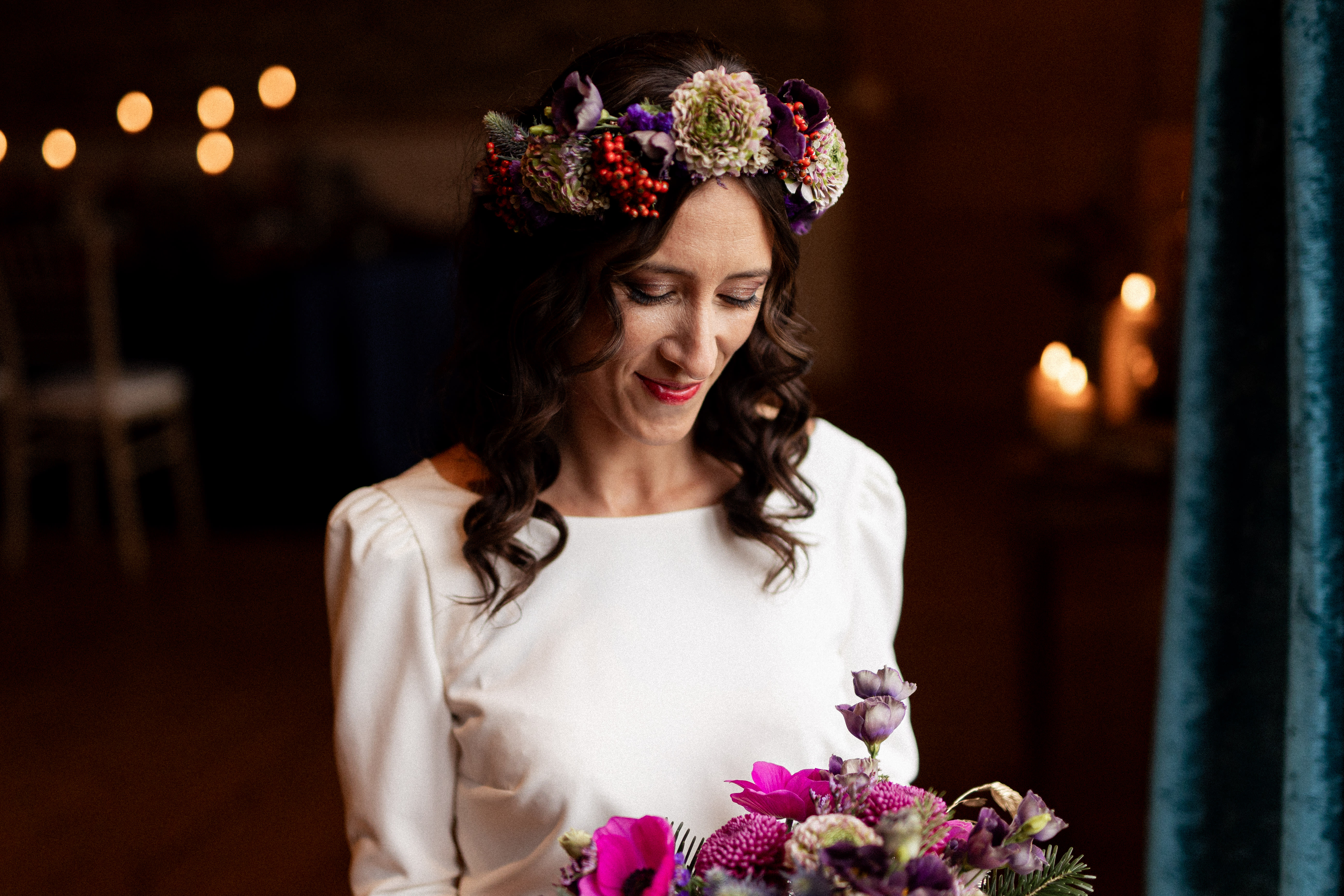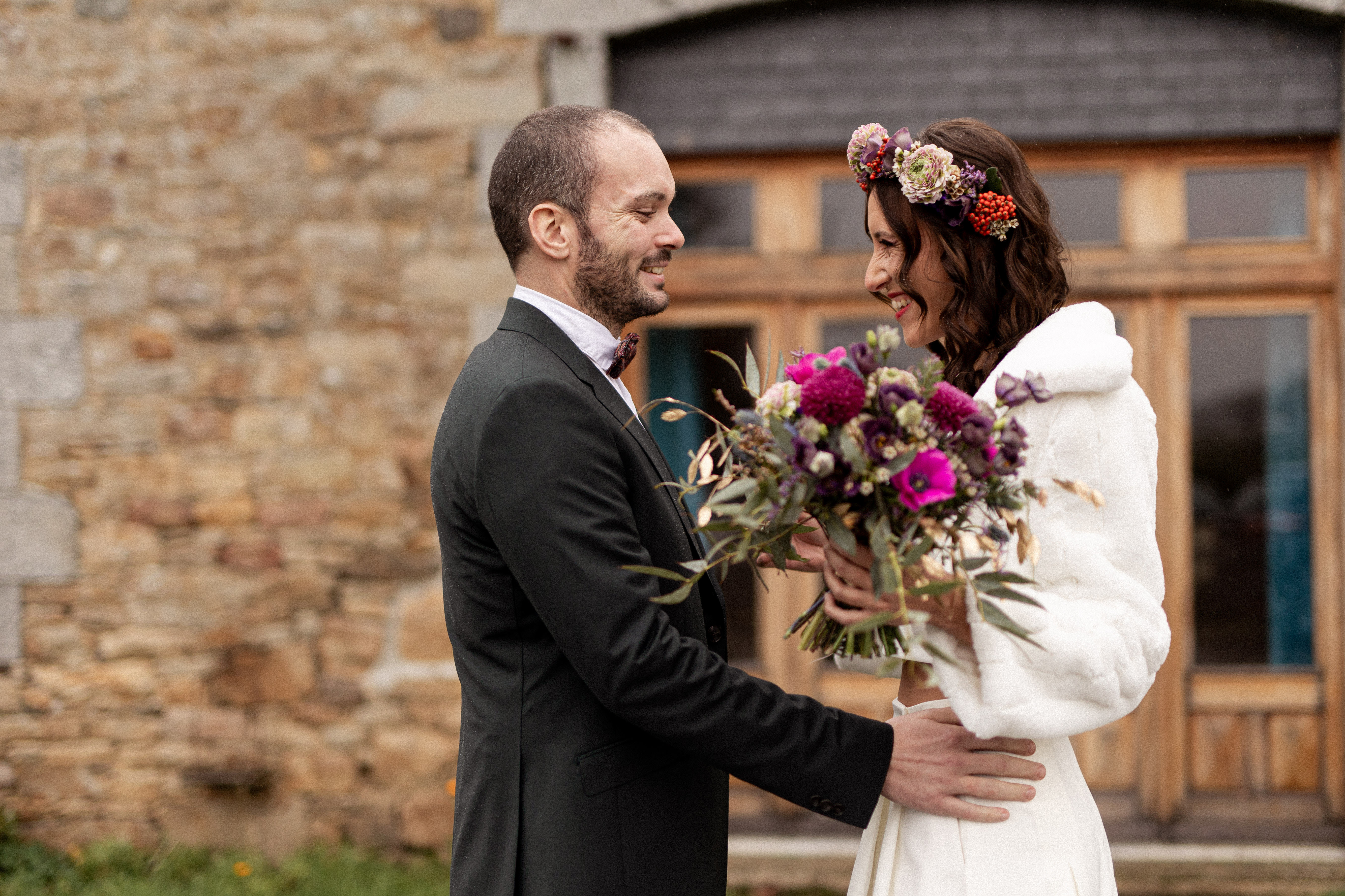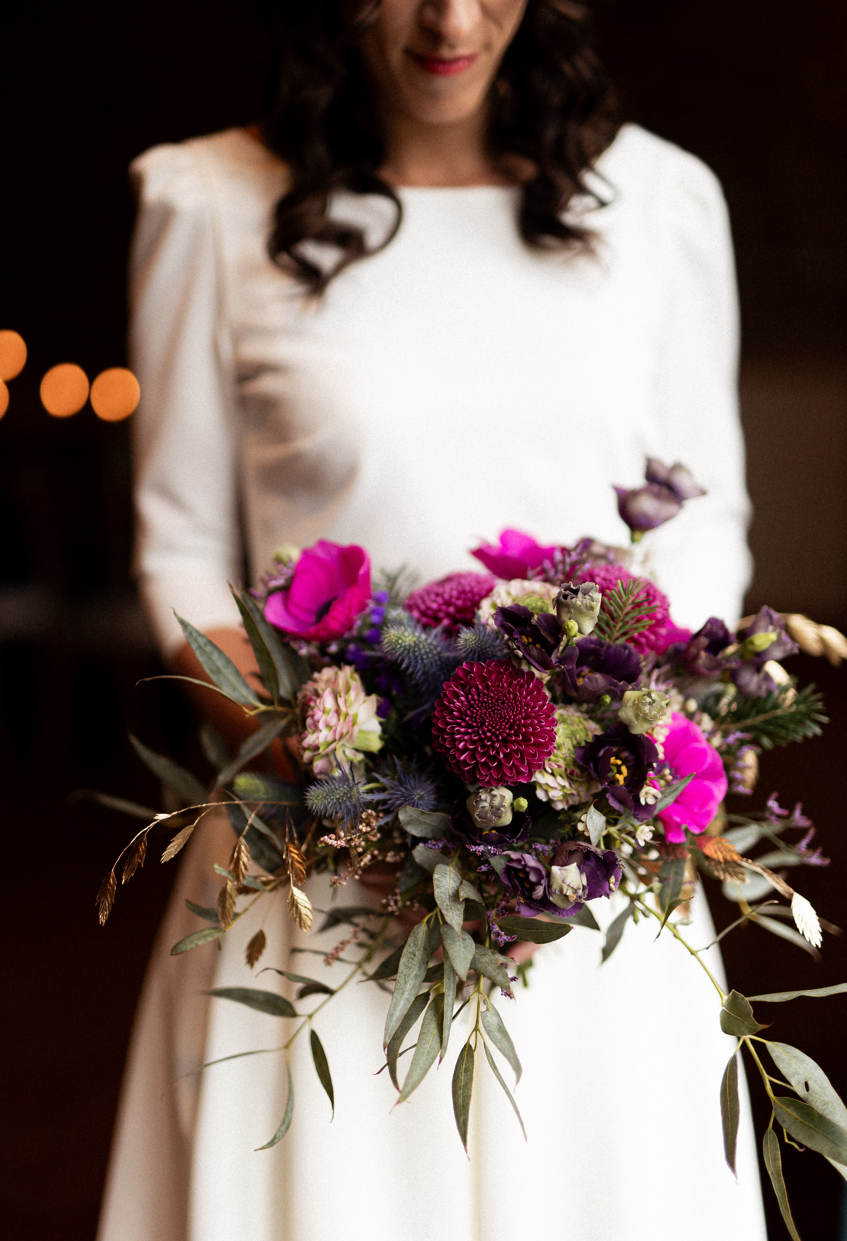 Sklaerenn de L’Atelier Doussik a choisi des fleurs de saison françaises dans des tons chauds, relevés de touches dorées. Chaque bouquet semble vivant, comme cueilli dans un jardin ancien au crépuscule.