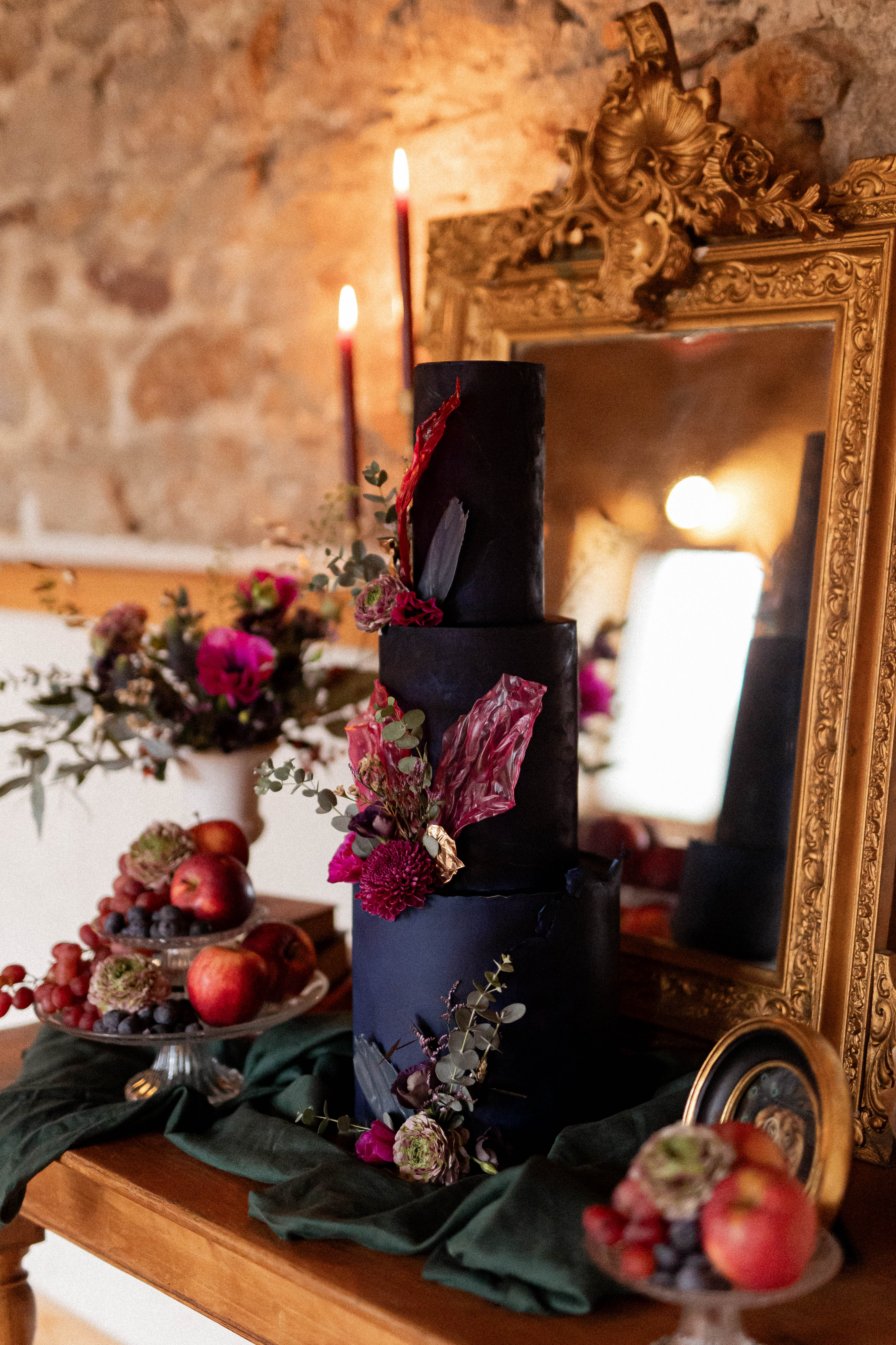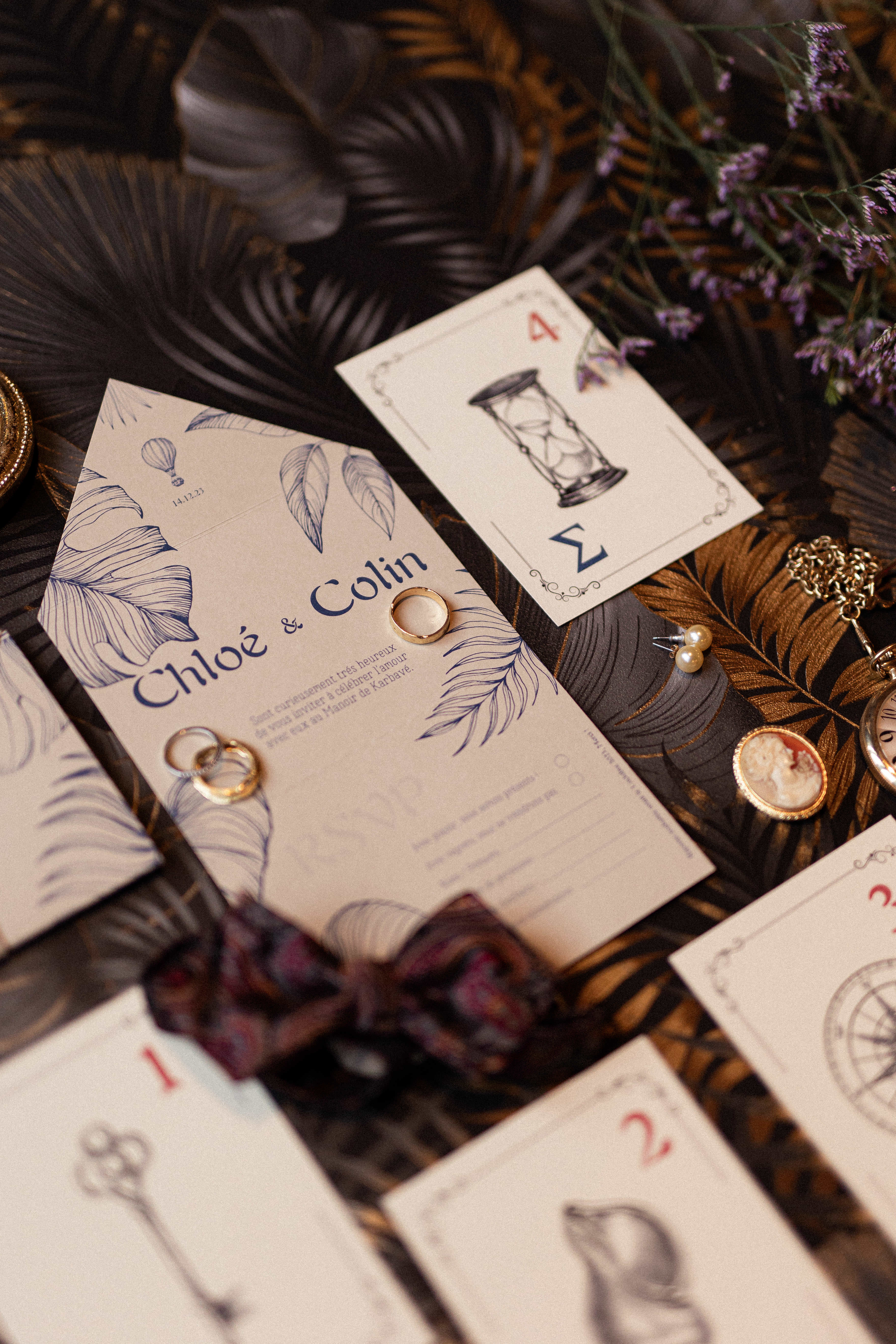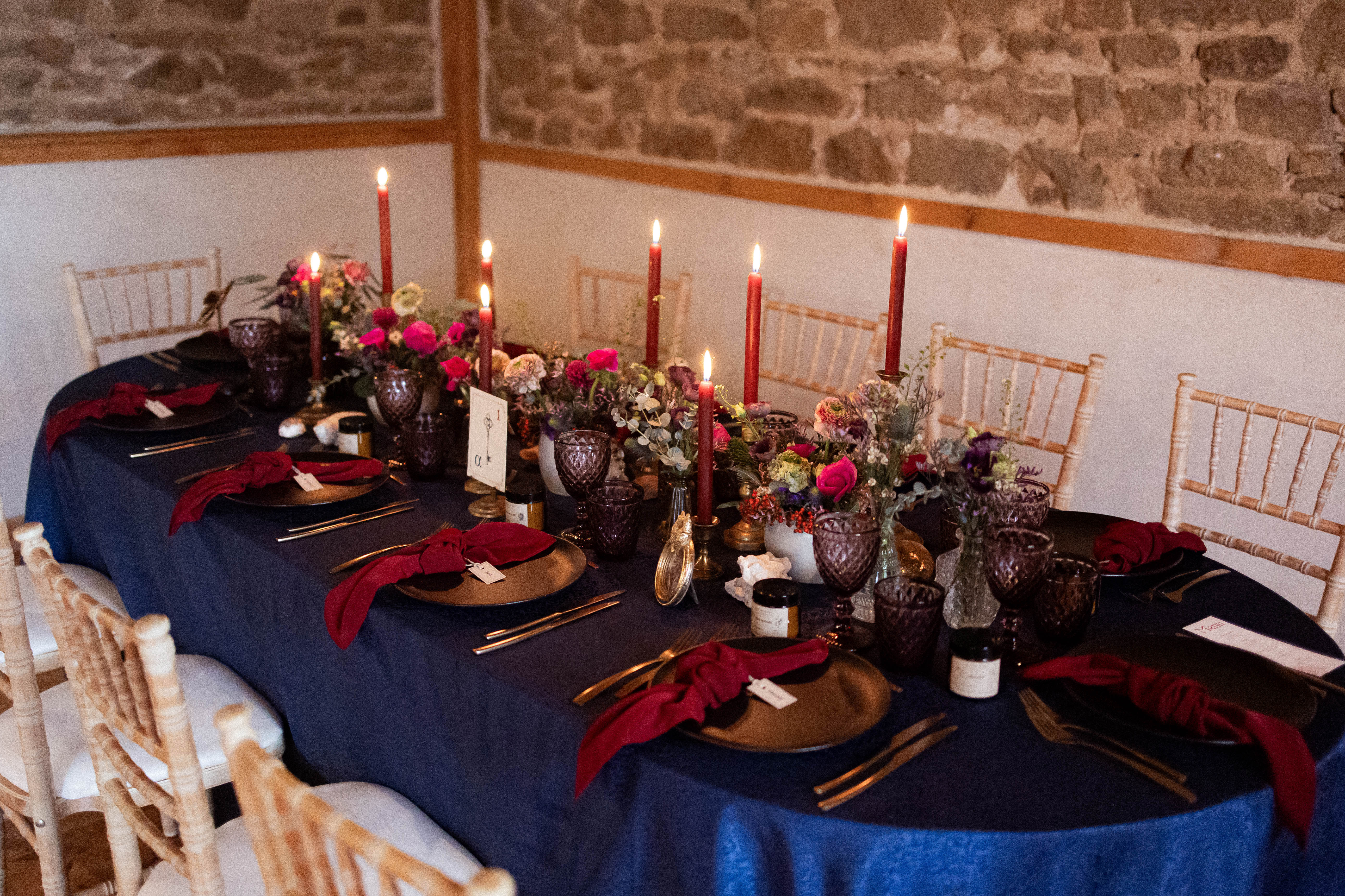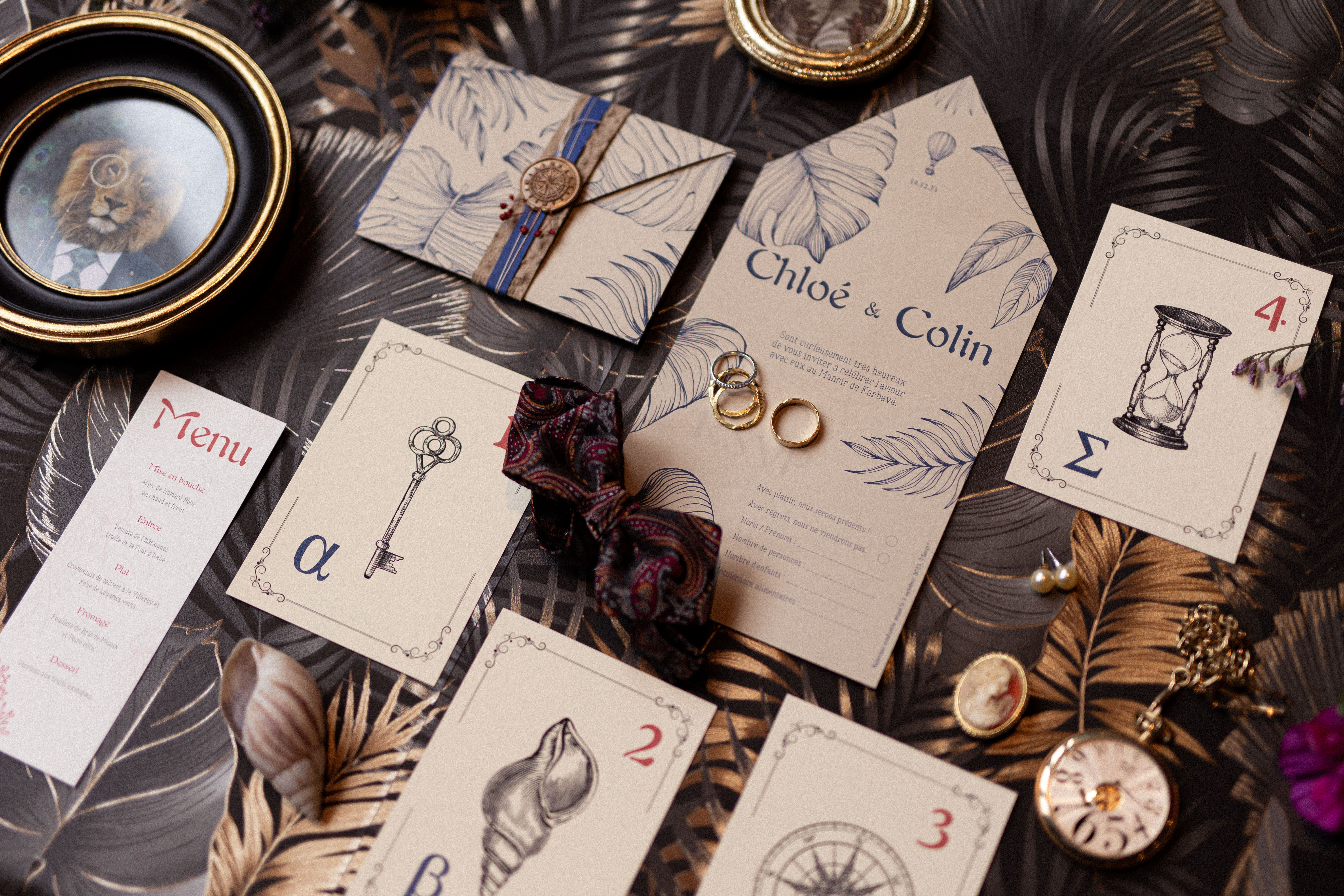 Pour ce projet, j’ai voulu créer un décor à la manière d’un ancien musée privé, où chaque recoin dévoile un trésor et chaque détail raconte une histoire. Le bleu marine, profond et raffiné, s’impose comme fil conducteur : il apparaît dans la décoration, la papeterie et le wedding cake, et donne le ton mystérieux et élégant de l’ensemble.