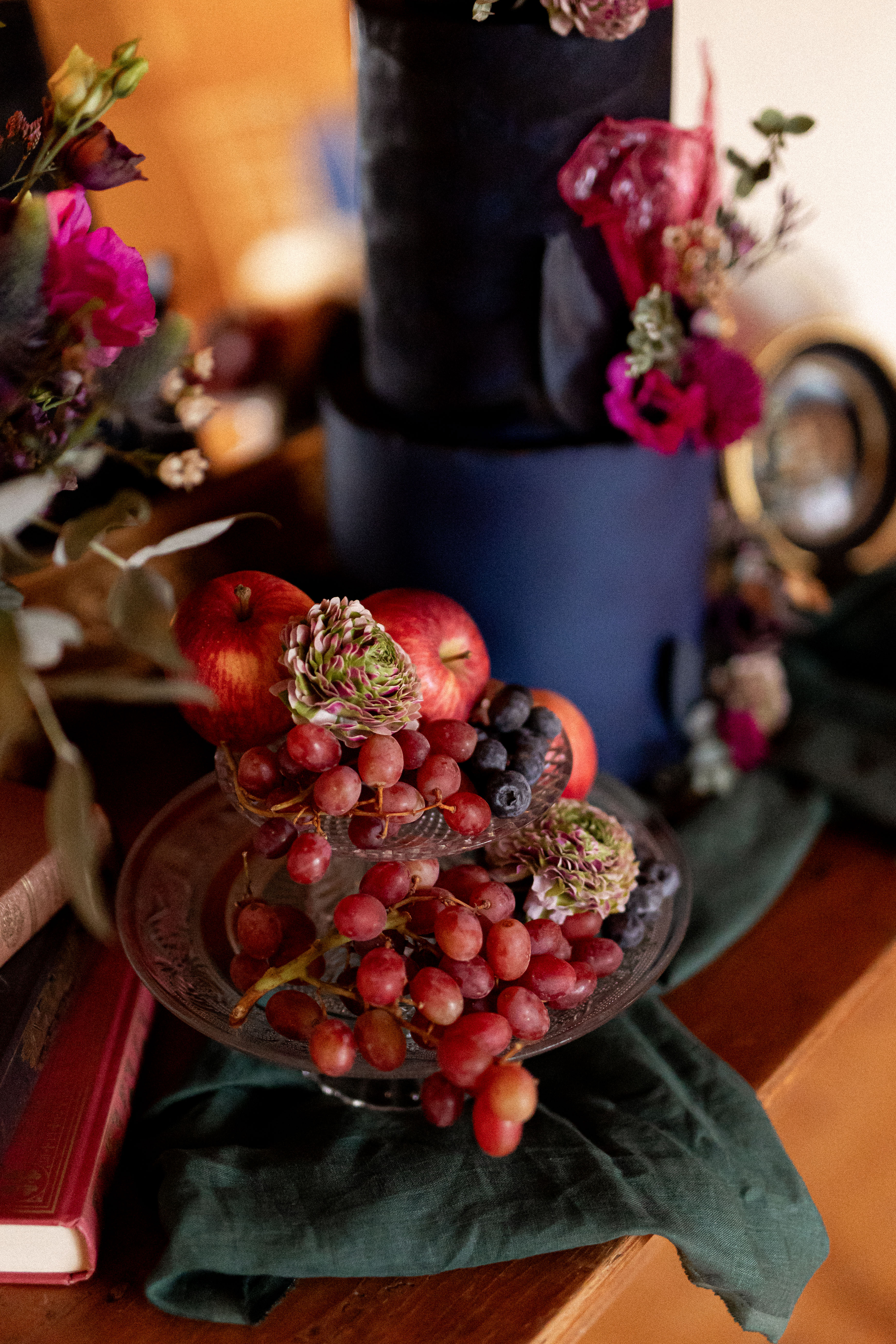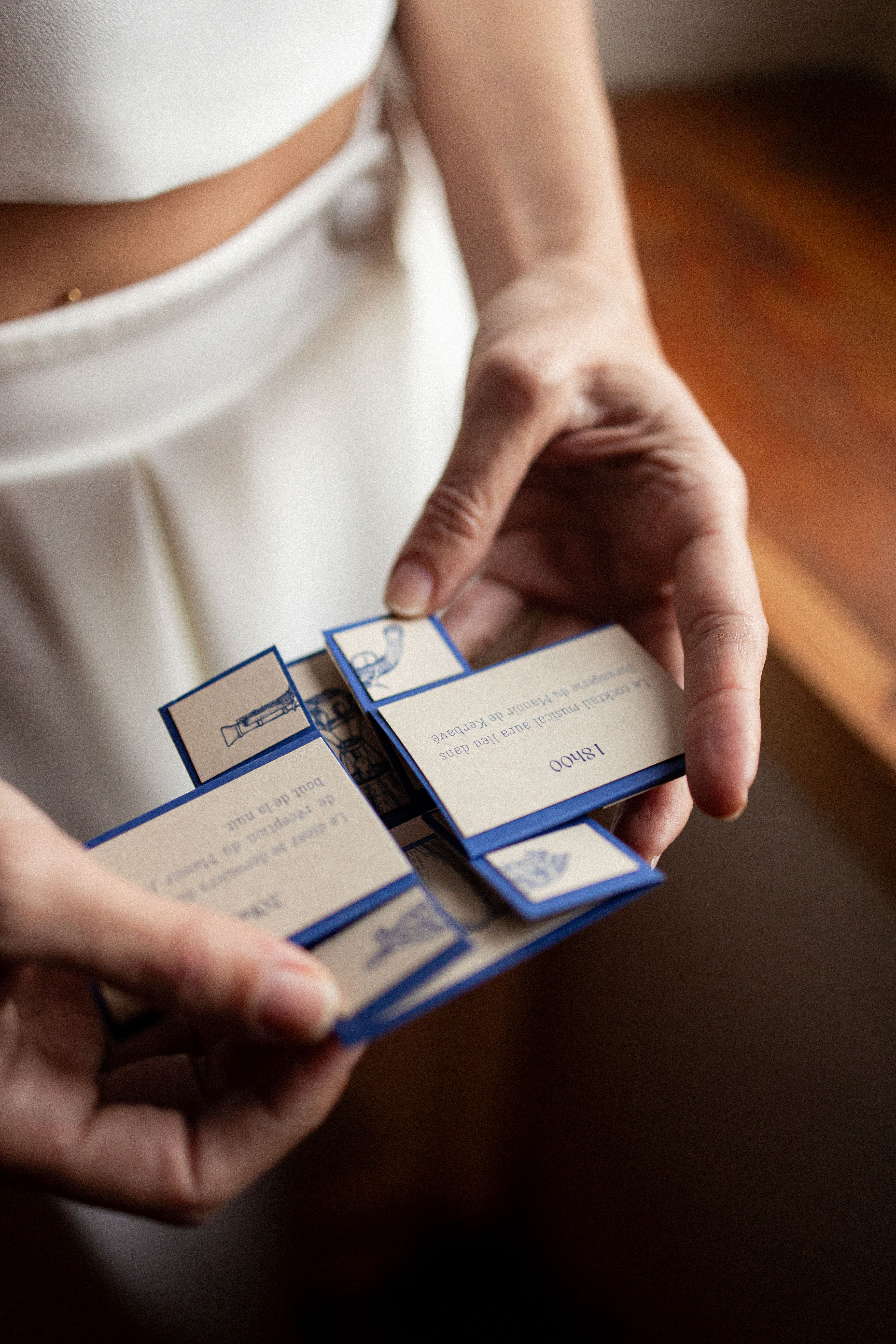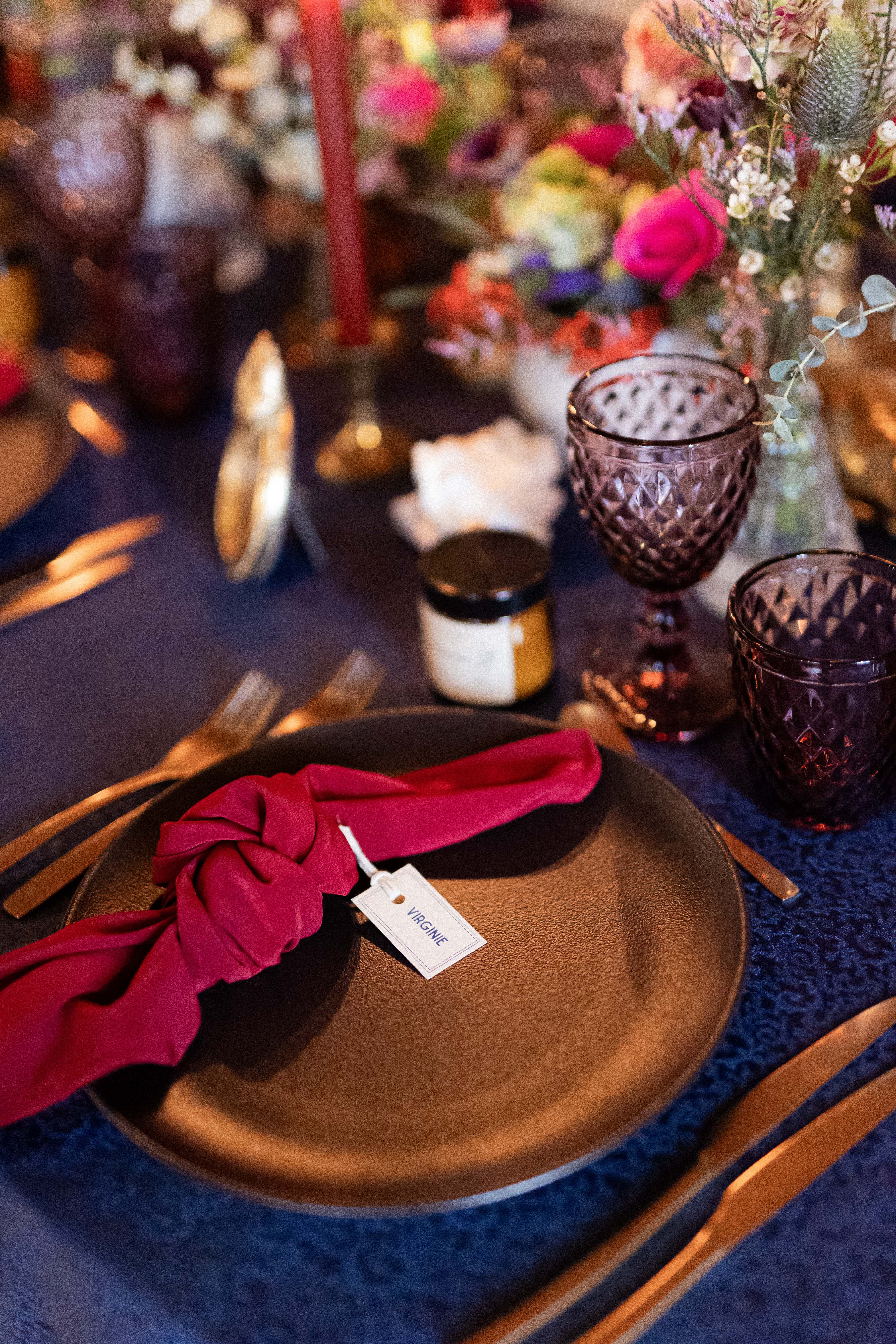 Pour ce projet, j’ai voulu créer un décor à la manière d’un ancien musée privé, où chaque recoin dévoile un trésor et chaque détail raconte une histoire. Le bleu marine, profond et raffiné, s’impose comme fil conducteur : il apparaît dans la décoration, la papeterie et le wedding cake, et donne le ton mystérieux et élégant de l’ensemble.