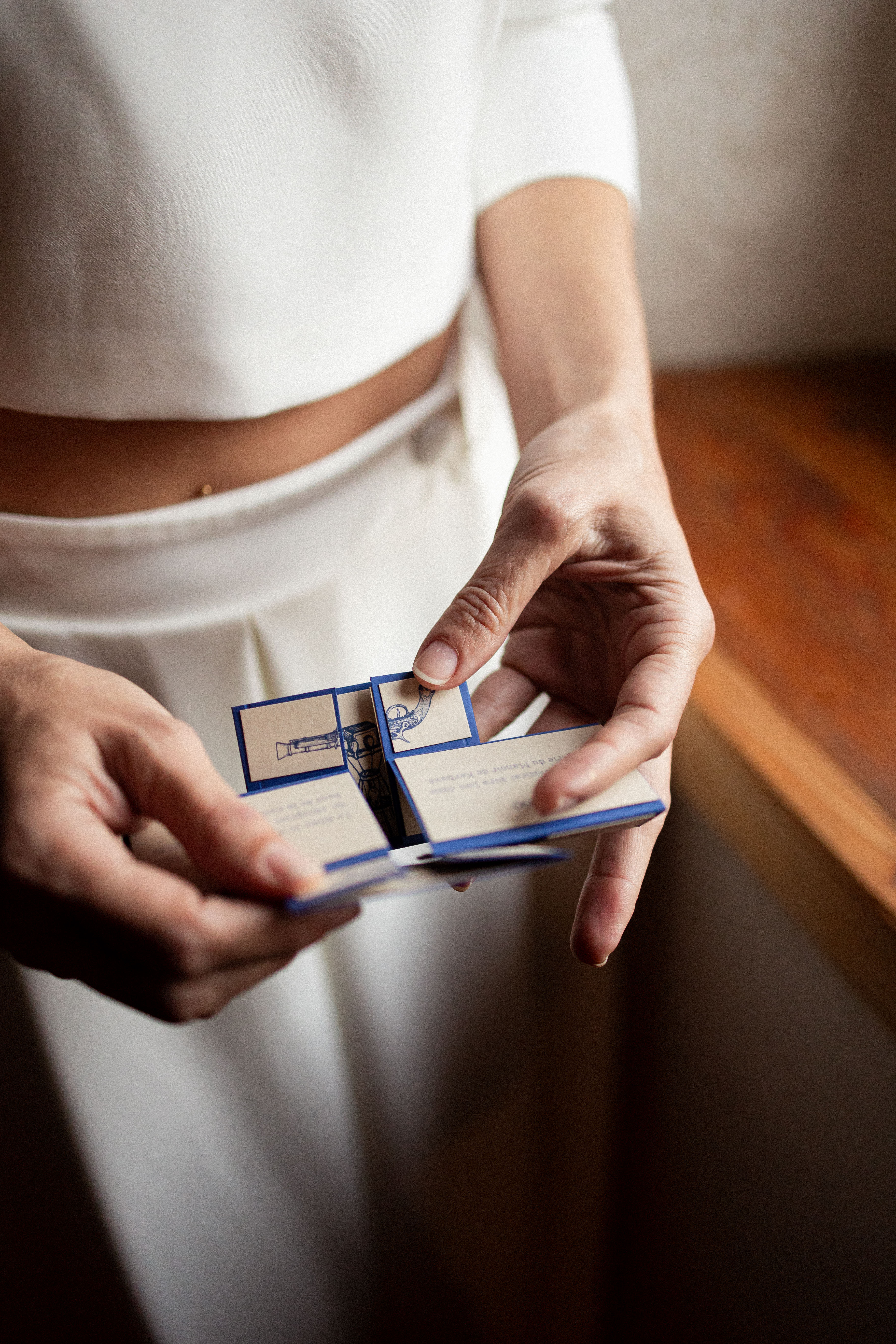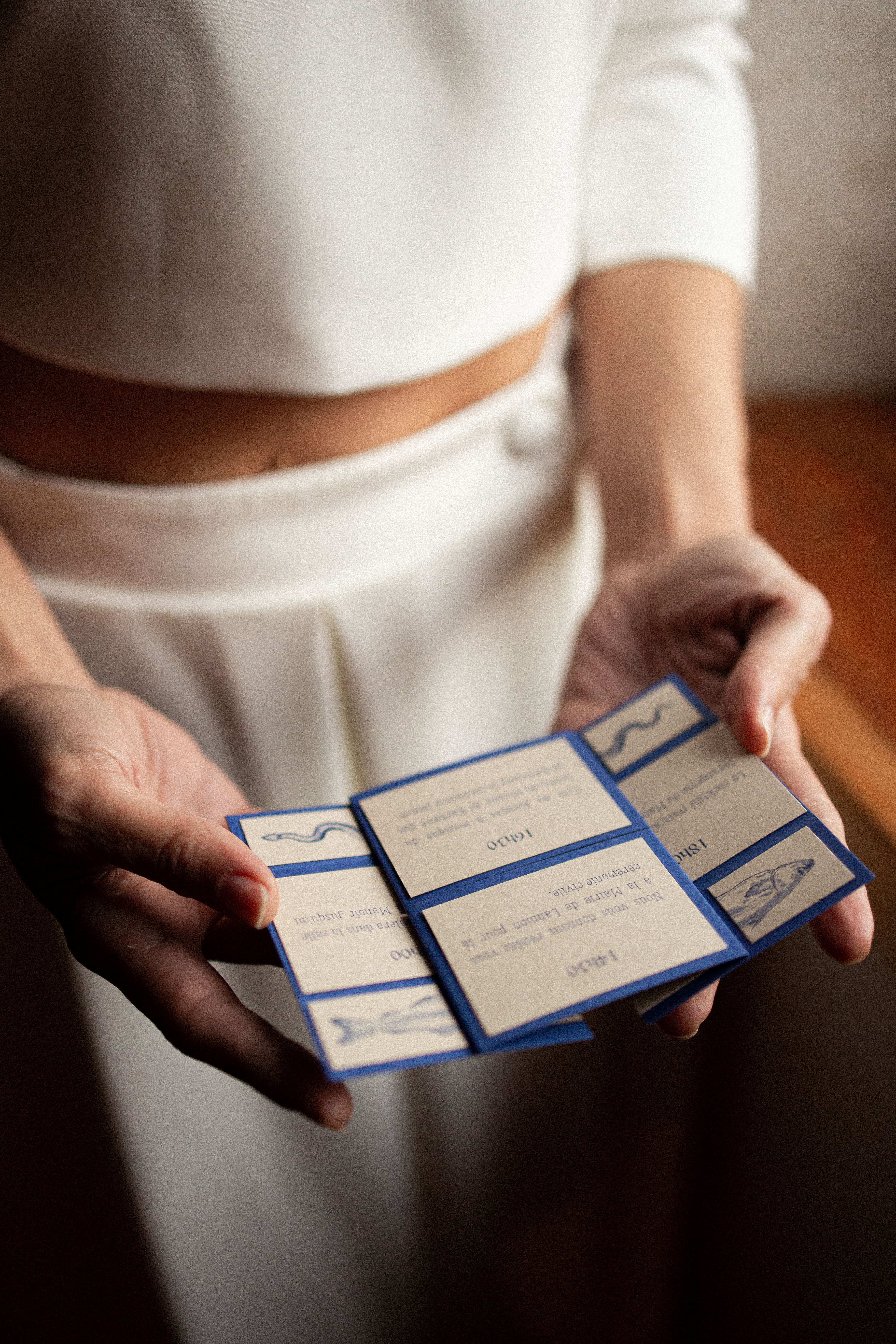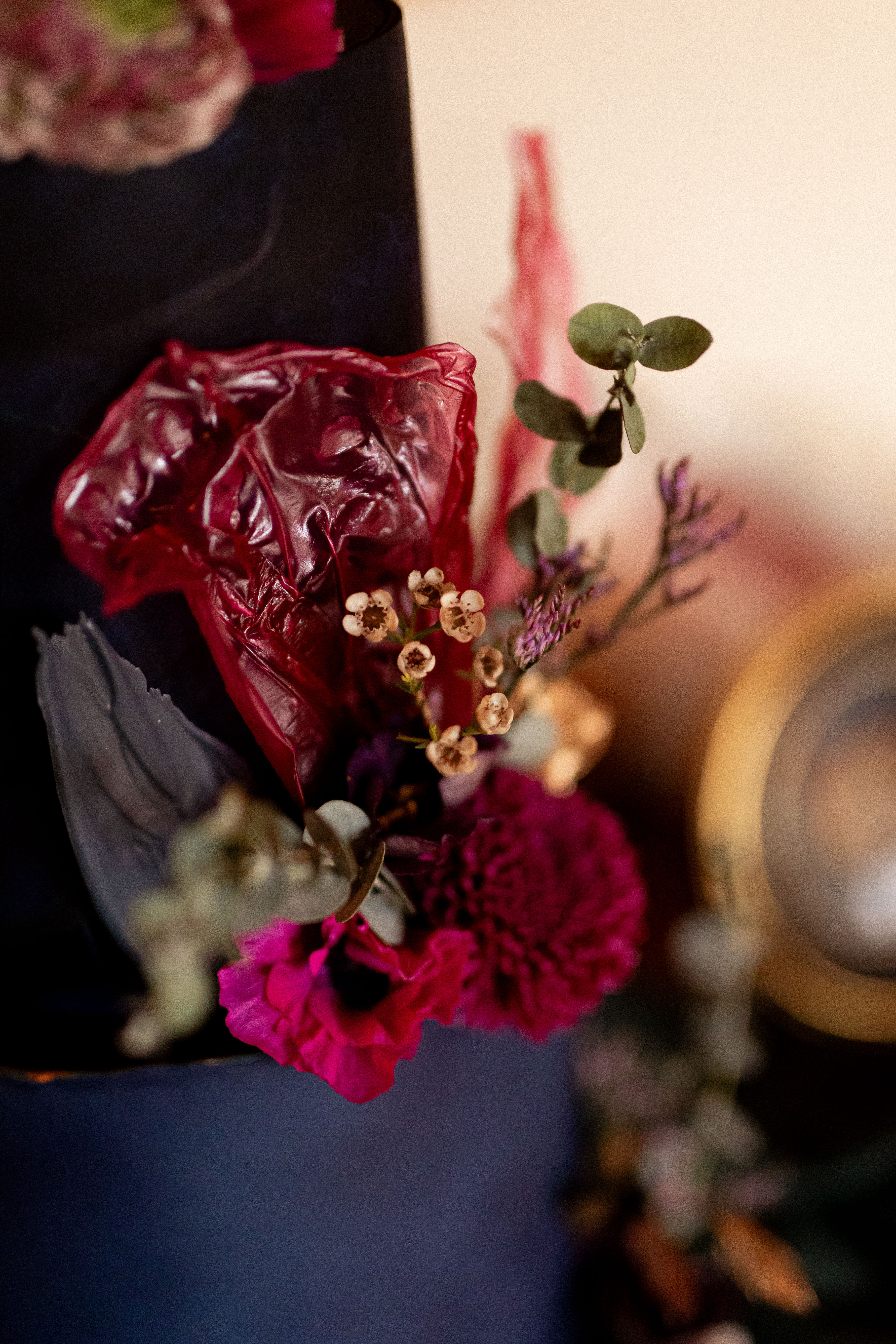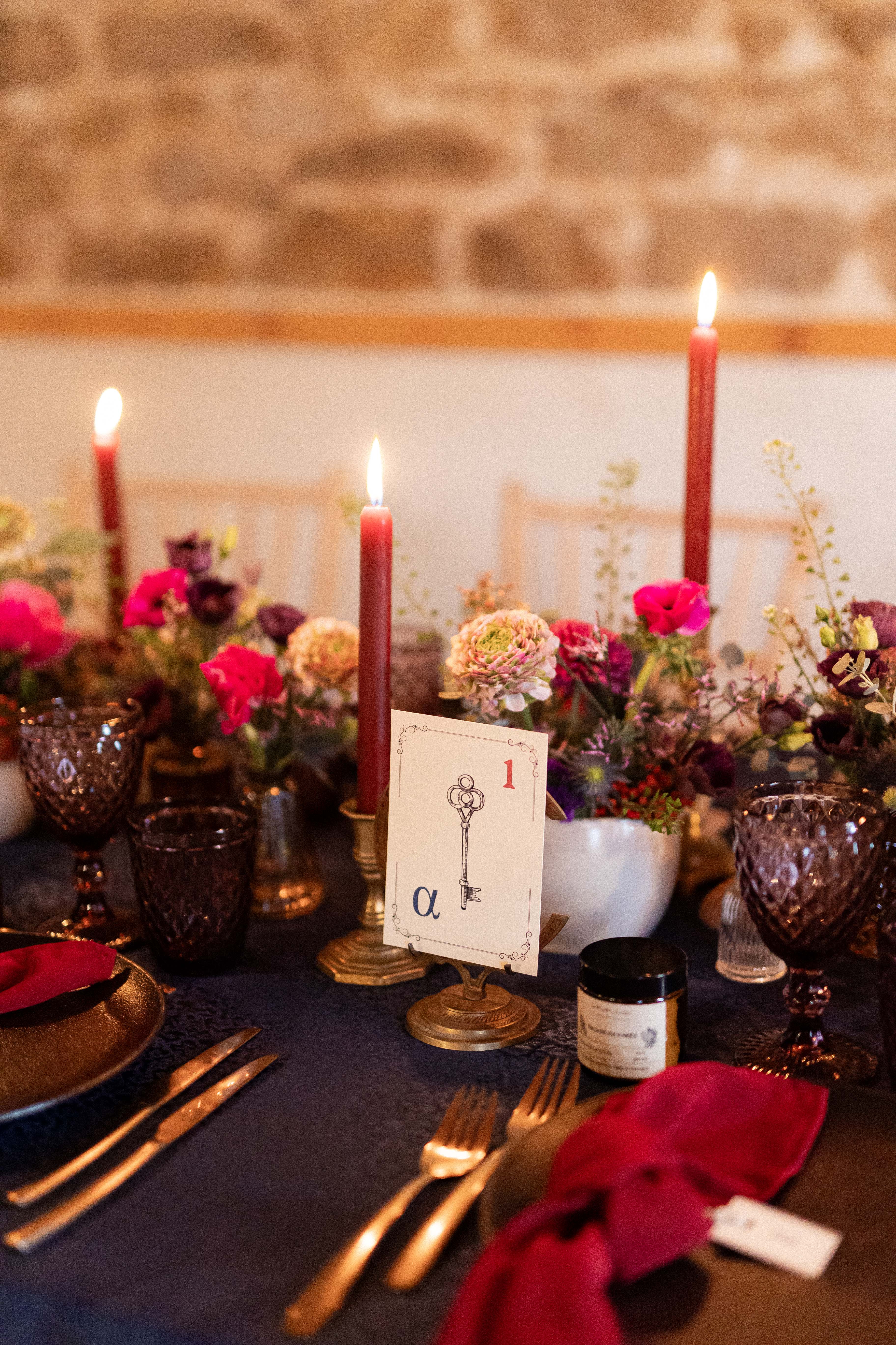 Pour ce projet, j’ai voulu créer un décor à la manière d’un ancien musée privé, où chaque recoin dévoile un trésor et chaque détail raconte une histoire. Le bleu marine, profond et raffiné, s’impose comme fil conducteur : il apparaît dans la décoration, la papeterie et le wedding cake, et donne le ton mystérieux et élégant de l’ensemble.